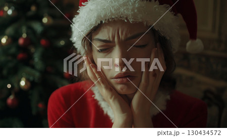 一名白人女子打扮成聖誕老人,閉著眼睛