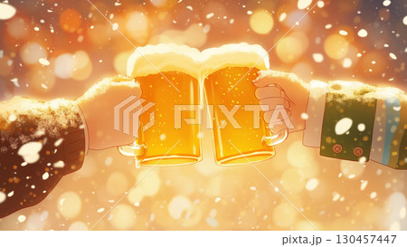 動漫風格:在雪地裡舉起啤酒杯敬酒