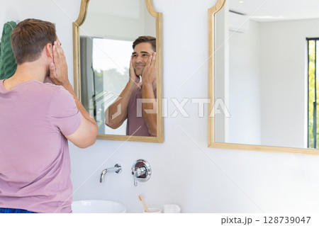 Man touching face at sink mirror in bright modern bathroom, with toothbrush and towel, copy space