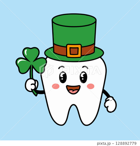 Cartoon Tooth Wearing Green Hat Holding Shamrock with Smiling Face