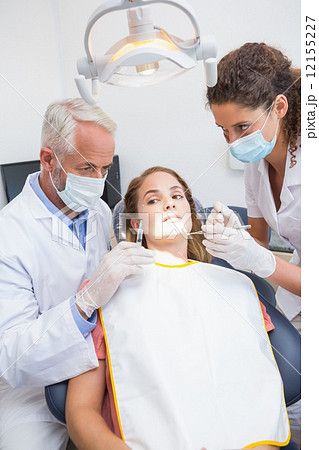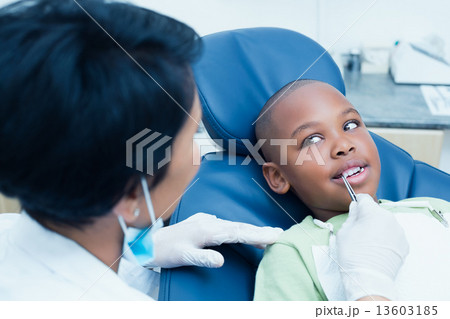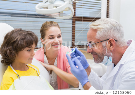 Pediatric dentist showing little boy a toothbrush with his mothe