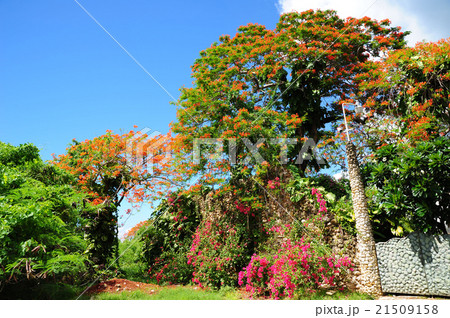 在陽光明媚的日子裡,日本月桂樹的花朵競相綻放。