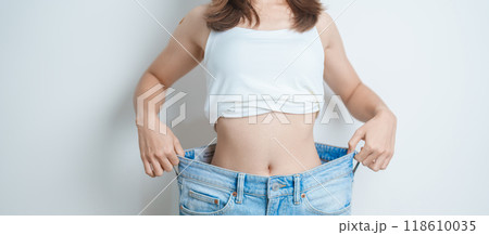 young slim female wearing big or oversize jeans, woman show healthy shape after weight loss. dieting, exercise, body fit and liposuction surgery concept