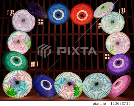 Shoji 背景 3DCG 框架與彩色日本雨傘排列