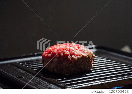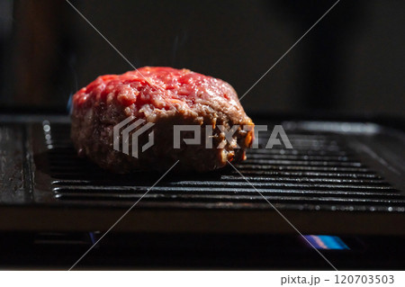 Hamburger Minced Raw Beef Steak on Grill with Flames.