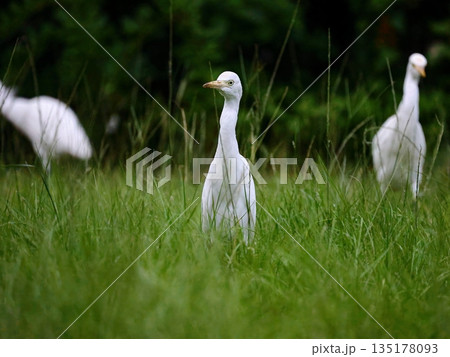 三隻白鷺在草地上覓食