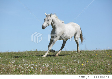 Nice white horse running on pasturage
