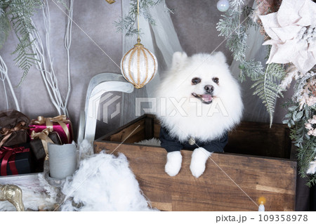 在聖誕樹和紅色斗篷的 Sheltie 小狗