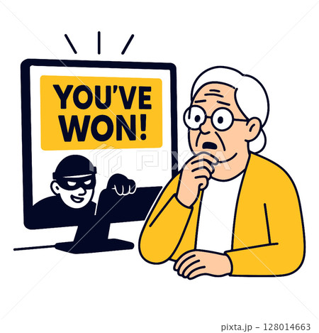 Surprised elderly person looking at computer screen displaying scam message