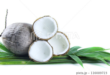 A close-up photograph of a mature and open coconuts isolated on a white background.