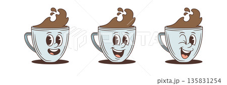 Joyful Coffee Cup Winking Face Retro Cartoon Character Vector Illustration Set