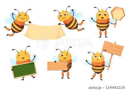 Bees signboard. Cartoon honey bee hold empty white sign, funny honeybee mascot with blank banner for school text or ad promotion billboard, study mascot neat vector illustration