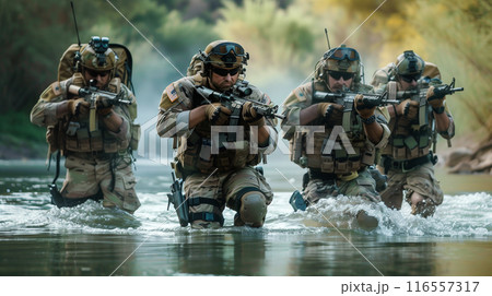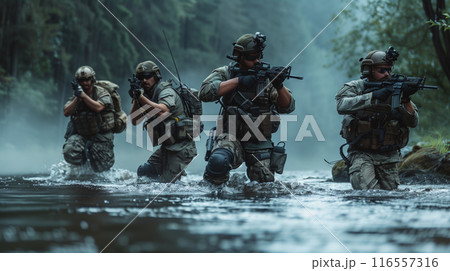 Elite soldiers stealthily maneuver through the dense forest, camouflaged in specialized gear, as they embark on a covert and strategic military mission