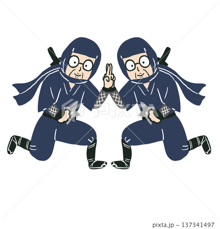 一名忍者單膝跪地,結印,一手握劍。