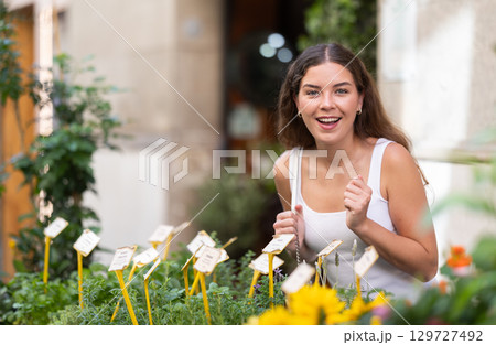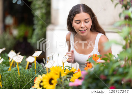 Female buyer looks at goods in outdoor shop, choose decorative potted sunflower