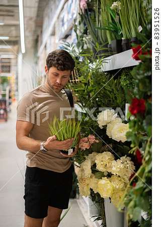 Man in casual clothes touching and inspecting potted grass plant while standing near shelves in floral department of mall