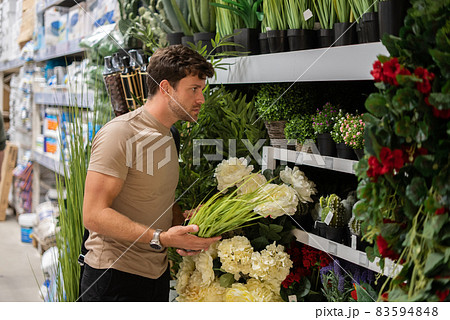 Man with potted grass choosing flowers from shelf while shopping in floral department of mall