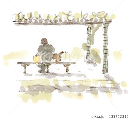 一幅冬季風景的水彩插圖,一隻狗和它的主人一起散步,坐在紫藤花架下的長椅上,欣賞著窗外的景色。