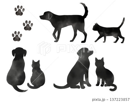 水彩狗貓剪影插畫素材,寵物腳印和姿勢套裝