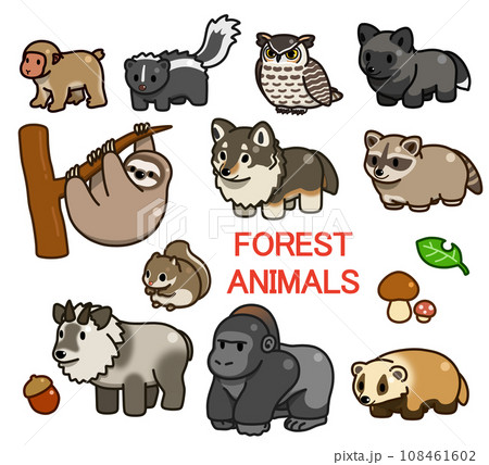 Forest wild animals on grassy ground painted illustration set. Hand drawn vintage style watercolor illustration. Grey wolf, grizzly bear, red fox forest animal on green grassy ground collection