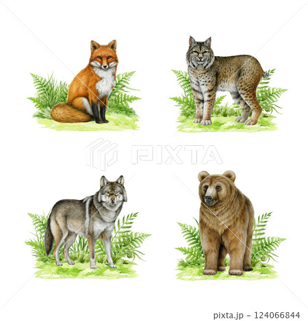 Wildlife forest animals on grassy ground illustration painted set. Hand drawn vintage style watercolor illustration. Grey wolf, grizzly bear, red fox, lynx on green grassy ground collection