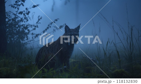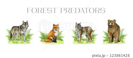 Forest predator animals on grassy ground illustration painted set. Hand drawn vintage style watercolor collection. Grey wolf, grizzly bear, red fox, lynx on green grassy ground with fern leaves decor