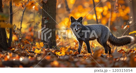 Fox in a forest with fallen leaves. Nature and wildlife concept.