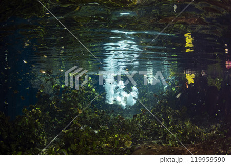 Diving in Mexican Cenote underwater cave snorkeling in surface photo taken from underwater with splashes
