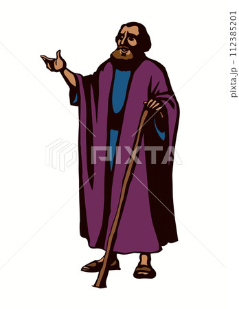 Vector drawing. Shepherd with sheep. Moses look at flaming bush