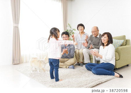 日本家庭撫養父母和男孩看著微笑的男孩的形象