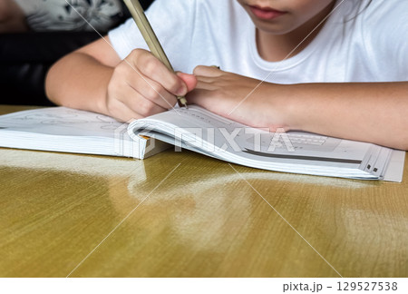 A student engages in independent learning, carefully completing workbook tasks without any assistance.