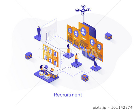 Recruitment isometric web banner. Personnel hiring and employment isometry concept. Human resource management, staff headhunting agency 3d scene design. Vector illustration with people characters.