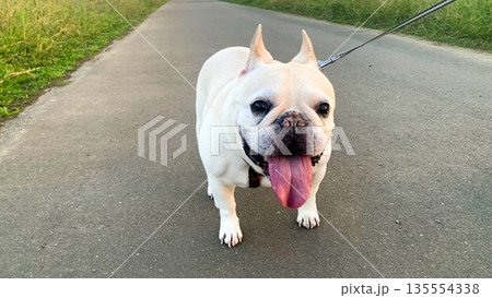 黃昏時分,一隻法國鬥牛犬在散步。