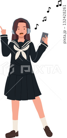 Japanese schoolgirl listening to music with headphones in school uniform. enjoying music on smartphone