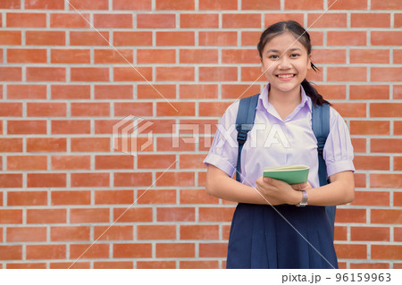 Thai asian school girl teen happy smile in uniform handle book and school bag with copy space