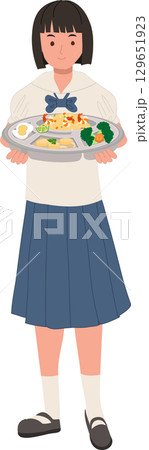 asian teenage female student in school uniform carrying lunch tray representing healthy eating and daily school routine