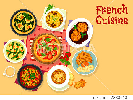 French cuisine food menu page. Vegetable soup, spinach quiche and onion soup, poached pears in red wine, tomato spinach quiche and vegetable stew ratatouille, banana French toasts, mushroom gratin
