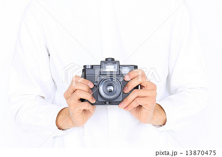 Girl 11 years old takes pictures with a toy wooden pink camera.