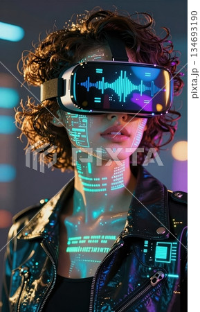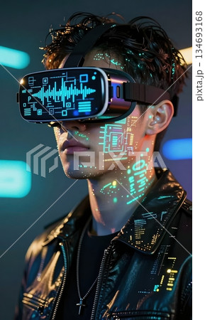 Futuristic Young Man Wearing Neon VR Headset with Holographic HUD Interface.