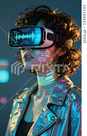 Futuristic Young Woman Wearing VR Headset with Digital Data Projection on Face in Cyberpunk Neon Light.