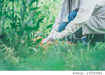 一個女人戴著草帽用割草線除草