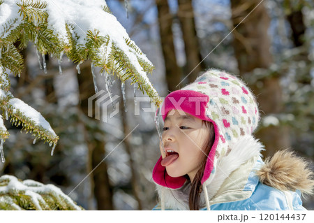 女孩舔著掛在樹枝上的冰柱