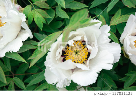 Blooming white tree peony in a botanical garden, close up.
