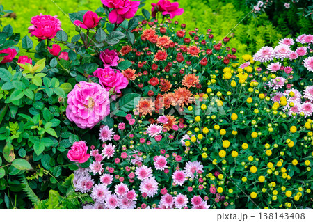 March 21 2026 Colorful pink roses and chrysanthemum flowers in garden
