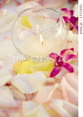 Lit candle with flowers.