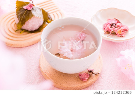 窗邊的桌子上擺著櫻桃色的櫻花麵包,上面鋪著鹹櫻花,還有茶。