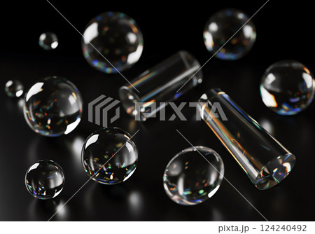 Shiny transparent bubbles in bright blue air, creating abstract background