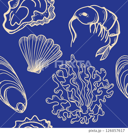 La dolce vita themed seamless pattern with Seafood. The Scallop, Shrimp, Coral, Oyster with hand drawn contour on blue background. Monochrome vector inspired by Summer Italian aesthetic.