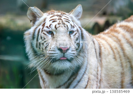 White tiger shows its characteristic stripes and unique features in a natural setting