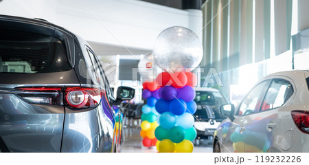 Car parked in luxury showroom. Car dealership office. Car showroom business. New car parked in modern showroom. Auto for sale and rent business. Automobile leasing and insurance. Electric automobile.